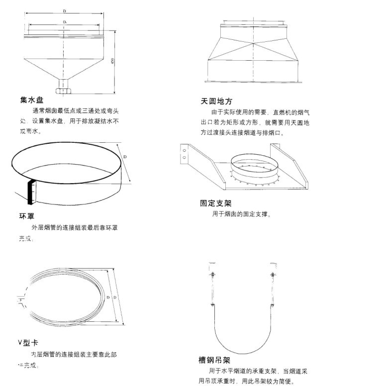 我公司设计 圆形,矩形,或其他截面形状的不同口径的不锈钢双层烟囱,冰可按客户需求设计制造单层碳钢或不锈钢烟囱。
